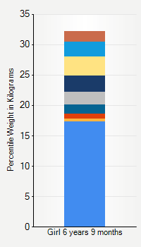 This chart shows weight percentiles, according to the CDC, for girls 7 months of age. To determine an individual's percentile, find the range that includes their weight. This percentile is not a reflection of optimal weight for an individual, it is only for comparing against a population sample. Use the navigation links above the summary chart to view the weight chart for a different age, or to switch between boys and girls or pounds and kilograms.
