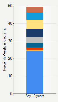 This chart shows weight percentiles, according to the CDC, for boys 10 years of age. To determine an individual's percentile, find the range that includes their weight. This percentile is not a reflection of optimal weight for an individual, it is only for comparing against a population sample. Use the navigation links above the summary chart to view the weight chart for a different age, or to switch between boys and girls or pounds and kilograms.