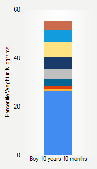 This chart shows weight percentiles, according to the CDC, for boys 10 years 10 months of age. To determine an individual's percentile, find the range that includes their weight. This percentile is not a reflection of optimal weight for an individual, it is only for comparing against a population sample. Use the navigation links above the summary chart to view the weight chart for a different age, or to switch between boys and girls or pounds and kilograms.