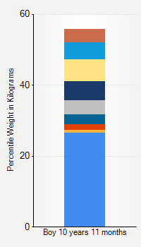 This chart shows weight percentiles, according to the CDC, for boys 10 years 11 months of age. To determine an individual's percentile, find the range that includes their weight. This percentile is not a reflection of optimal weight for an individual, it is only for comparing against a population sample. Use the navigation links above the summary chart to view the weight chart for a different age, or to switch between boys and girls or pounds and kilograms.