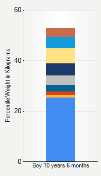 This chart shows weight percentiles, according to the CDC, for boys 10 years 6 months of age. To determine an individual's percentile, find the range that includes their weight. This percentile is not a reflection of optimal weight for an individual, it is only for comparing against a population sample. Use the navigation links above the summary chart to view the weight chart for a different age, or to switch between boys and girls or pounds and kilograms.