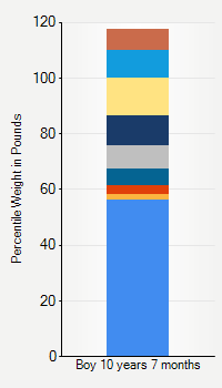 This chart shows weight percentiles, according to the CDC, for boys 10 years 7 months of age. To determine an individual's percentile, find the range that includes their weight. This percentile is not a reflection of optimal weight for an individual, it is only for comparing against a population sample. Use the navigation links above the summary chart to view the weight chart for a different age, or to switch between boys and girls or pounds and kilograms.