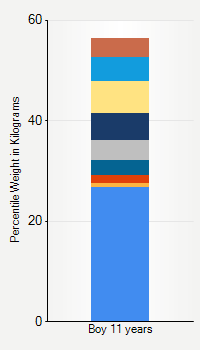 This chart shows weight percentiles, according to the CDC, for boys 11 years of age. To determine an individual's percentile, find the range that includes their weight. This percentile is not a reflection of optimal weight for an individual, it is only for comparing against a population sample. Use the navigation links above the summary chart to view the weight chart for a different age, or to switch between boys and girls or pounds and kilograms.