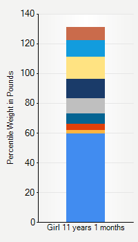 This chart shows weight percentiles, according to the CDC, for girls 11 years 1 month of age. To determine an individual's percentile, find the range that includes their weight. This percentile is not a reflection of optimal weight for an individual, it is only for comparing against a population sample. Use the navigation links above the summary chart to view the weight chart for a different age, or to switch between boys and girls or pounds and kilograms.