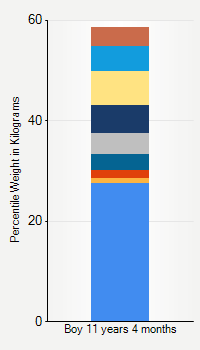 This chart shows weight percentiles, according to the CDC, for boys 11 years 4 months of age. To determine an individual's percentile, find the range that includes their weight. This percentile is not a reflection of optimal weight for an individual, it is only for comparing against a population sample. Use the navigation links above the summary chart to view the weight chart for a different age, or to switch between boys and girls or pounds and kilograms.