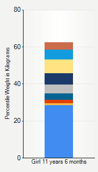 This chart shows weight percentiles, according to the CDC, for girls 11 years 6 months of age. To determine an individual's percentile, find the range that includes their weight. This percentile is not a reflection of optimal weight for an individual, it is only for comparing against a population sample. Use the navigation links above the summary chart to view the weight chart for a different age, or to switch between boys and girls or pounds and kilograms.