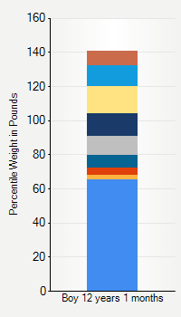 This chart shows weight percentiles, according to the CDC, for boys 12 years 1 month of age. To determine an individual's percentile, find the range that includes their weight. This percentile is not a reflection of optimal weight for an individual, it is only for comparing against a population sample. Use the navigation links above the summary chart to view the weight chart for a different age, or to switch between boys and girls or pounds and kilograms.
