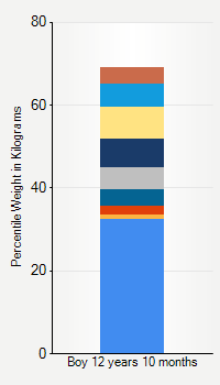 This chart shows weight percentiles, according to the CDC, for boys 12 years 10 months of age. To determine an individual's percentile, find the range that includes their weight. This percentile is not a reflection of optimal weight for an individual, it is only for comparing against a population sample. Use the navigation links above the summary chart to view the weight chart for a different age, or to switch between boys and girls or pounds and kilograms.