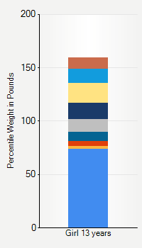 This chart shows weight percentiles, according to the CDC, for girls 13 years of age. To determine an individual's percentile, find the range that includes their weight. This percentile is not a reflection of optimal weight for an individual, it is only for comparing against a population sample. Use the navigation links above the summary chart to view the weight chart for a different age, or to switch between boys and girls or pounds and kilograms.