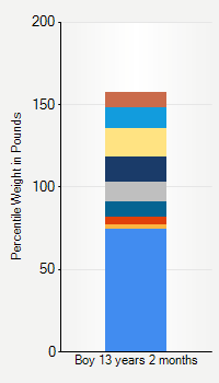 This chart shows weight percentiles, according to the CDC, for boys 13 years 2 months of age. To determine an individual's percentile, find the range that includes their weight. This percentile is not a reflection of optimal weight for an individual, it is only for comparing against a population sample. Use the navigation links above the summary chart to view the weight chart for a different age, or to switch between boys and girls or pounds and kilograms.