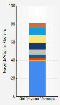 This chart shows weight percentiles, according to the CDC, for boys 13 years 4 months of age. To determine an individual's percentile, find the range that includes their weight. This percentile is not a reflection of optimal weight for an individual, it is only for comparing against a population sample. Use the navigation links above the summary chart to view the weight chart for a different age, or to switch between boys and girls or pounds and kilograms.