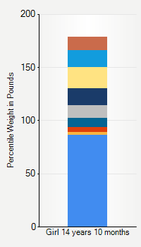 This chart shows weight percentiles, according to the CDC, for girls 14 years 10 months of age. To determine an individual's percentile, find the range that includes their weight. This percentile is not a reflection of optimal weight for an individual, it is only for comparing against a population sample. Use the navigation links above the summary chart to view the weight chart for a different age, or to switch between boys and girls or pounds and kilograms.