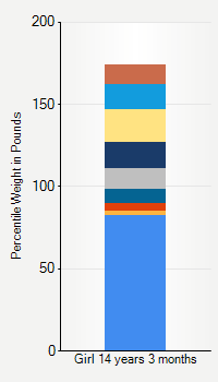 This chart shows weight percentiles, according to the CDC, for girls 14 years 3 months of age. To determine an individual's percentile, find the range that includes their weight. This percentile is not a reflection of optimal weight for an individual, it is only for comparing against a population sample. Use the navigation links above the summary chart to view the weight chart for a different age, or to switch between boys and girls or pounds and kilograms.