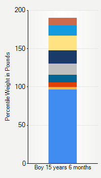 This chart shows weight percentiles, according to the CDC, for boys 15 years 6 months of age. To determine an individual's percentile, find the range that includes their weight. This percentile is not a reflection of optimal weight for an individual, it is only for comparing against a population sample. Use the navigation links above the summary chart to view the weight chart for a different age, or to switch between boys and girls or pounds and kilograms.
