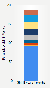 This chart shows weight percentiles, according to the CDC, for girls 16 years 1 month of age. To determine an individual's percentile, find the range that includes their weight. This percentile is not a reflection of optimal weight for an individual, it is only for comparing against a population sample. Use the navigation links above the summary chart to view the weight chart for a different age, or to switch between boys and girls or pounds and kilograms.