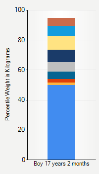 This chart shows weight percentiles, according to the CDC, for boys 17 years 2 months of age. To determine an individual's percentile, find the range that includes their weight. This percentile is not a reflection of optimal weight for an individual, it is only for comparing against a population sample. Use the navigation links above the summary chart to view the weight chart for a different age, or to switch between boys and girls or pounds and kilograms.