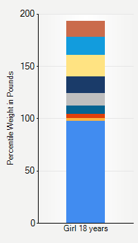 This chart shows weight percentiles, according to the CDC, for girls 18 years of age. To determine an individual's percentile, find the range that includes their weight. This percentile is not a reflection of optimal weight for an individual, it is only for comparing against a population sample. Use the navigation links above the summary chart to view the weight chart for a different age, or to switch between boys and girls or pounds and kilograms.