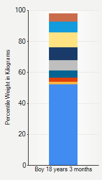 This chart shows weight percentiles, according to the CDC, for boys 18 years 3 months of age. To determine an individual's percentile, find the range that includes their weight. This percentile is not a reflection of optimal weight for an individual, it is only for comparing against a population sample. Use the navigation links above the summary chart to view the weight chart for a different age, or to switch between boys and girls or pounds and kilograms.