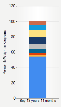 This chart shows weight percentiles, according to the CDC, for boys 19 years 11 months of age. To determine an individual's percentile, find the range that includes their weight. This percentile is not a reflection of optimal weight for an individual, it is only for comparing against a population sample. Use the navigation links above the summary chart to view the weight chart for a different age, or to switch between boys and girls or pounds and kilograms.