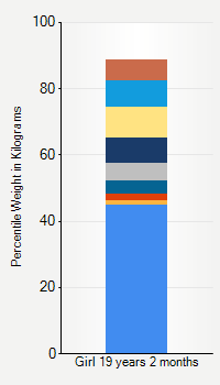 This chart shows weight percentiles, according to the CDC, for girls 19 years 2 months of age. To determine an individual's percentile, find the range that includes their weight. This percentile is not a reflection of optimal weight for an individual, it is only for comparing against a population sample. Use the navigation links above the summary chart to view the weight chart for a different age, or to switch between boys and girls or pounds and kilograms.