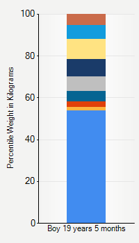 This chart shows weight percentiles, according to the CDC, for boys 19 years 5 months of age. To determine an individual's percentile, find the range that includes their weight. This percentile is not a reflection of optimal weight for an individual, it is only for comparing against a population sample. Use the navigation links above the summary chart to view the weight chart for a different age, or to switch between boys and girls or pounds and kilograms.