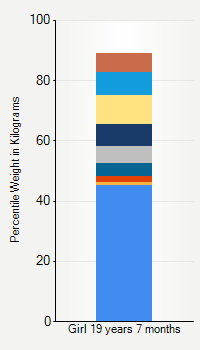 This chart shows weight percentiles, according to the CDC, for girls 19 years 7 months of age. To determine an individual's percentile, find the range that includes their weight. This percentile is not a reflection of optimal weight for an individual, it is only for comparing against a population sample. Use the navigation links above the summary chart to view the weight chart for a different age, or to switch between boys and girls or pounds and kilograms.