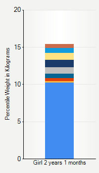 This chart shows weight percentiles, according to the CDC, for girls 2 years 1 month of age. To determine an individual's percentile, find the range that includes their weight. This percentile is not a reflection of optimal weight for an individual, it is only for comparing against a population sample. Use the navigation links above the summary chart to view the weight chart for a different age, or to switch between boys and girls or pounds and kilograms.