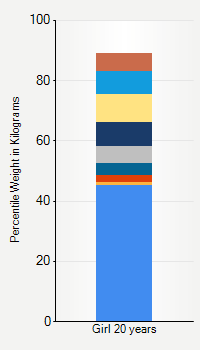 This chart shows weight percentiles, according to the CDC, for girls 20 years of age. To determine an individual's percentile, find the range that includes their weight. This percentile is not a reflection of optimal weight for an individual, it is only for comparing against a population sample. Use the navigation links above the summary chart to view the weight chart for a different age, or to switch between boys and girls or pounds and kilograms.
