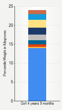 This chart shows weight percentiles, according to the CDC, for girls 4 years 9 months of age. To determine an individual's percentile, find the range that includes their weight. This percentile is not a reflection of optimal weight for an individual, it is only for comparing against a population sample. Use the navigation links above the summary chart to view the weight chart for a different age, or to switch between boys and girls or pounds and kilograms.