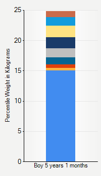 This chart shows weight percentiles, according to the CDC, for boys 5 years 1 month of age. To determine an individual's percentile, find the range that includes their weight. This percentile is not a reflection of optimal weight for an individual, it is only for comparing against a population sample. Use the navigation links above the summary chart to view the weight chart for a different age, or to switch between boys and girls or pounds and kilograms.