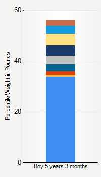 This chart shows weight percentiles, according to the CDC, for boys 5 years 3 months of age. To determine an individual's percentile, find the range that includes their weight. This percentile is not a reflection of optimal weight for an individual, it is only for comparing against a population sample. Use the navigation links above the summary chart to view the weight chart for a different age, or to switch between boys and girls or pounds and kilograms.