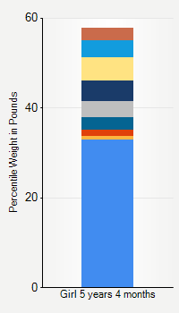 This chart shows weight percentiles, according to the CDC, for girls 5 years 4 months of age. To determine an individual's percentile, find the range that includes their weight. This percentile is not a reflection of optimal weight for an individual, it is only for comparing against a population sample. Use the navigation links above the summary chart to view the weight chart for a different age, or to switch between boys and girls or pounds and kilograms.