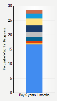 This chart shows weight percentiles, according to the CDC, for boys 6 years 1 month of age. To determine an individual's percentile, find the range that includes their weight. This percentile is not a reflection of optimal weight for an individual, it is only for comparing against a population sample. Use the navigation links above the summary chart to view the weight chart for a different age, or to switch between boys and girls or pounds and kilograms.