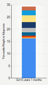 This chart shows weight percentiles, according to the CDC, for girls 6 years 1 month of age. To determine an individual's percentile, find the range that includes their weight. This percentile is not a reflection of optimal weight for an individual, it is only for comparing against a population sample. Use the navigation links above the summary chart to view the weight chart for a different age, or to switch between boys and girls or pounds and kilograms.