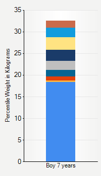 This chart shows weight percentiles, according to the CDC, for boys 7 years of age. To determine an individual's percentile, find the range that includes their weight. This percentile is not a reflection of optimal weight for an individual, it is only for comparing against a population sample. Use the navigation links above the summary chart to view the weight chart for a different age, or to switch between boys and girls or pounds and kilograms.
