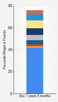 This chart shows weight percentiles, according to the CDC, for boys 7 years 5 months of age. To determine an individual's percentile, find the range that includes their weight. This percentile is not a reflection of optimal weight for an individual, it is only for comparing against a population sample. Use the navigation links above the summary chart to view the weight chart for a different age, or to switch between boys and girls or pounds and kilograms.
