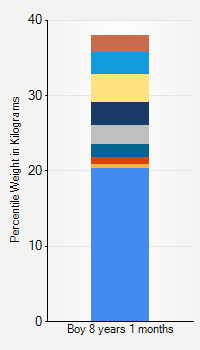 This chart shows weight percentiles, according to the CDC, for boys 8 years 1 month of age. To determine an individual's percentile, find the range that includes their weight. This percentile is not a reflection of optimal weight for an individual, it is only for comparing against a population sample. Use the navigation links above the summary chart to view the weight chart for a different age, or to switch between boys and girls or pounds and kilograms.