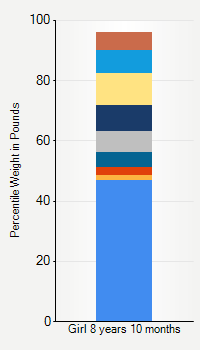 This chart shows weight percentiles, according to the CDC, for girls 8 years 10 months of age. To determine an individual's percentile, find the range that includes their weight. This percentile is not a reflection of optimal weight for an individual, it is only for comparing against a population sample. Use the navigation links above the summary chart to view the weight chart for a different age, or to switch between boys and girls or pounds and kilograms.