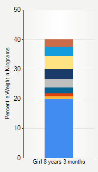 This chart shows weight percentiles, according to the CDC, for girls 8 years 3 months of age. To determine an individual's percentile, find the range that includes their weight. This percentile is not a reflection of optimal weight for an individual, it is only for comparing against a population sample. Use the navigation links above the summary chart to view the weight chart for a different age, or to switch between boys and girls or pounds and kilograms.