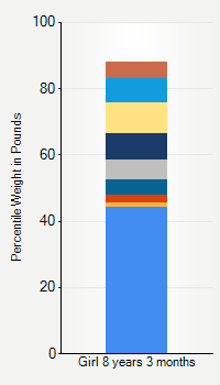 This chart shows weight percentiles, according to the CDC, for girls 8 years 3 months of age. To determine an individual's percentile, find the range that includes their weight. This percentile is not a reflection of optimal weight for an individual, it is only for comparing against a population sample. Use the navigation links above the summary chart to view the weight chart for a different age, or to switch between boys and girls or pounds and kilograms.