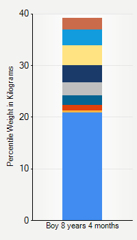 This chart shows weight percentiles, according to the CDC, for boys 8 years 4 months of age. To determine an individual's percentile, find the range that includes their weight. This percentile is not a reflection of optimal weight for an individual, it is only for comparing against a population sample. Use the navigation links above the summary chart to view the weight chart for a different age, or to switch between boys and girls or pounds and kilograms.