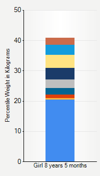This chart shows weight percentiles, according to the CDC, for girls 8 years 5 months of age. To determine an individual's percentile, find the range that includes their weight. This percentile is not a reflection of optimal weight for an individual, it is only for comparing against a population sample. Use the navigation links above the summary chart to view the weight chart for a different age, or to switch between boys and girls or pounds and kilograms.