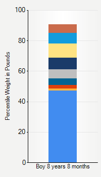 This chart shows weight percentiles, according to the CDC, for boys 8 years 8 months of age. To determine an individual's percentile, find the range that includes their weight. This percentile is not a reflection of optimal weight for an individual, it is only for comparing against a population sample. Use the navigation links above the summary chart to view the weight chart for a different age, or to switch between boys and girls or pounds and kilograms.