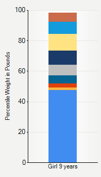 This chart shows weight percentiles, according to the CDC, for girls 9 years of age. To determine an individual's percentile, find the range that includes their weight. This percentile is not a reflection of optimal weight for an individual, it is only for comparing against a population sample. Use the navigation links above the summary chart to view the weight chart for a different age, or to switch between boys and girls or pounds and kilograms.