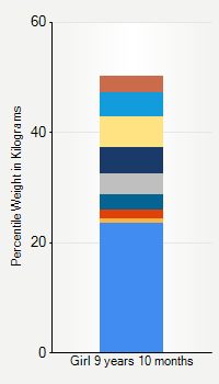 This chart shows weight percentiles, according to the CDC, for girls 9 years 10 months of age. To determine an individual's percentile, find the range that includes their weight. This percentile is not a reflection of optimal weight for an individual, it is only for comparing against a population sample. Use the navigation links above the summary chart to view the weight chart for a different age, or to switch between boys and girls or pounds and kilograms.