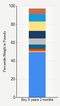 This chart shows weight percentiles, according to the CDC, for boys 9 years 2 months of age. To determine an individual's percentile, find the range that includes their weight. This percentile is not a reflection of optimal weight for an individual, it is only for comparing against a population sample. Use the navigation links above the summary chart to view the weight chart for a different age, or to switch between boys and girls or pounds and kilograms.