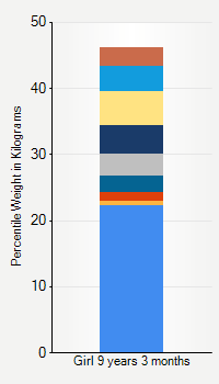 This chart shows weight percentiles, according to the CDC, for girls 9 years 3 months of age. To determine an individual's percentile, find the range that includes their weight. This percentile is not a reflection of optimal weight for an individual, it is only for comparing against a population sample. Use the navigation links above the summary chart to view the weight chart for a different age, or to switch between boys and girls or pounds and kilograms.