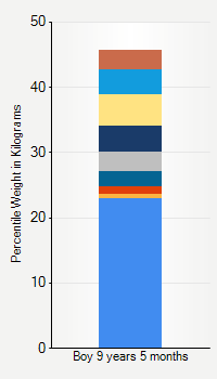 This chart shows weight percentiles, according to the CDC, for boys 9 years 5 months of age. To determine an individual's percentile, find the range that includes their weight. This percentile is not a reflection of optimal weight for an individual, it is only for comparing against a population sample. Use the navigation links above the summary chart to view the weight chart for a different age, or to switch between boys and girls or pounds and kilograms.