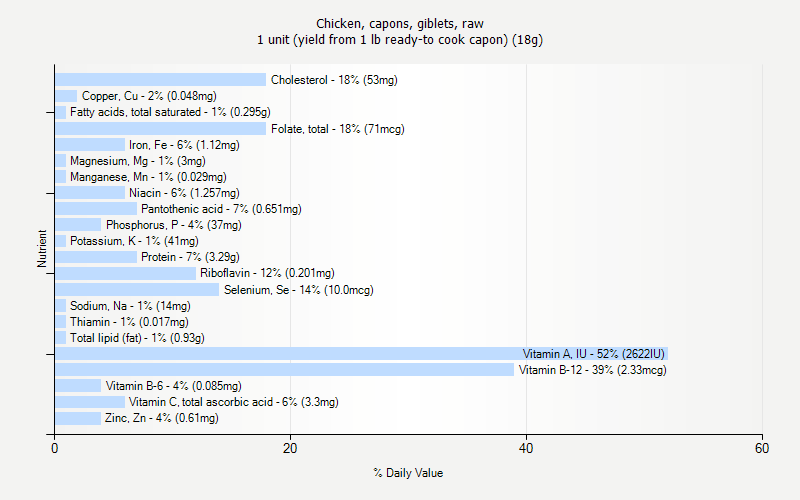 Alanine 1.070 gArginine 1.383 gAsh 1.15 gAspartic acid 1.976 gCalcium, Ca 12 mgCarbohydrate, by difference 1.63 gCholesterol 336 mgCopper, Cu 0.308 mgCystine 0.279 gEnergy 150 kcalEnergy 626 kjFatty acids, total monounsaturated 1.518 gFatty acids, total polyunsaturated 1.368 gFatty acids, total saturated 1.886 gFiber, total dietary 0.0 gFolate, DFE 453 mcg_DFEFolate, food 453 mcgFolate, total 453 mcgFolic acid 0 mcgGlutamic acid 3.108 gGlycine 1.168 gHistidine 0.503 gIron, Fe 7.19 mgIsoleucine 1.066 gLeucine 1.720 gLysine 1.548 gMagnesium, Mg 21 mgManganese, Mn 0.187 mgMethionine 0.520 gNiacin 8.032 mgPantothenic acid 4.161 mgPhenylalanine 0.967 gPhosphorus, P 238 mgPotassium, K 260 mgProline 1.065 gProtein 21.02 gRetinol 5030 mcgRiboflavin 1.287 mgSelenium, Se 63.6 mcgSerine 0.915 gSodium, Na 89 mgThiamin 0.112 mgThreonine 0.950 gTotal lipid (fat) 5.96 gTryptophan 0.250 gTyrosine 0.700 gValine 1.158 gVitamin A, IU 16751 IUVitamin A, RAE 5030 mcg_RAEVitamin B-12 14.89 mcgVitamin B-6 0.540 mgVitamin C, total ascorbic acid 21.2 mgWater 85.24 gZinc, Zn 3.89 mg10:0 0.000 g12:0 0.000 g14:0 0.023 g16:0 1.046 g16:1 undifferentiated 0.207 g18:0 0.690 g18:1 undifferentiated 1.288 g18:2 undifferentiated 0.932 g18:3 undifferentiated 0.034 g20:1 0.012 g20:4 undifferentiated 0.322 g20:5 n-3 0.012 g22:1 undifferentiated 0.000 g22:5 n-3 0.000 g22:6 n-3 0.046 g