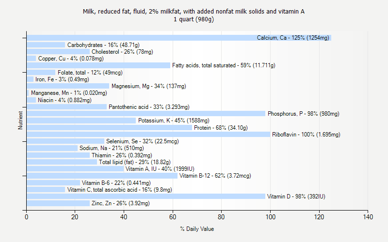 Alanine 0.294 gAlcohol, ethyl 0.0 gArginine 0.309 gAsh 1.89 gAspartic acid 0.647 gCalcium, Ca 314 mgCarbohydrate, by difference 12.18 gCholesterol 20 mgCopper, Cu 0.020 mgCystine 0.078 gEnergy 125 kcalEnergy 522 kjFatty acids, total monounsaturated 1.360 gFatty acids, total polyunsaturated 0.174 gFatty acids, total saturated 2.928 gFiber, total dietary 0.0 gFolate, DFE 12 mcg_DFEFolate, food 12 mcgFolate, total 12 mcgFolic acid 0 mcgGlutamic acid 1.786 gGlycine 0.181 gHistidine 0.230 gIron, Fe 0.12 mgIsoleucine 0.517 gLeucine 0.835 gLysine 0.676 gMagnesium, Mg 34 mgManganese, Mn 0.005 mgMethionine 0.213 gNiacin 0.220 mgPantothenic acid 0.823 mgPhenylalanine 0.412 gPhosphorus, P 245 mgPotassium, K 397 mgProline 0.826 gProtein 8.53 gRetinol 135 mcgRiboflavin 0.424 mgSelenium, Se 5.6 mcgSerine 0.463 gSodium, Na 127 mgThiamin 0.098 mgThreonine 0.385 gTotal lipid (fat) 4.70 gTryptophan 0.120 gTyrosine 0.412 gValine 0.571 gVitamin A, IU 500 IUVitamin A, RAE 137 mcg_RAEVitamin B-12 0.93 mcgVitamin B-6 0.110 mgVitamin C, total ascorbic acid 2.4 mgVitamin D 98 IUWater 217.71 gZinc, Zn 0.98 mg10:0 0.118 g12:0 0.132 g14:0 0.473 g16:0 1.237 g16:1 undifferentiated 0.105 g18:0 0.571 g18:1 undifferentiated 1.183 g18:2 undifferentiated 0.105 g18:3 undifferentiated 0.069 g18:4 0.000 g20:1 0.000 g20:4 undifferentiated 0.000 g20:5 n-3 0.000 g22:1 undifferentiated 0.000 g22:5 n-3 0.000 g22:6 n-3 0.000 g4:0 0.152 g6:0 0.091 g8:0 0.051 g